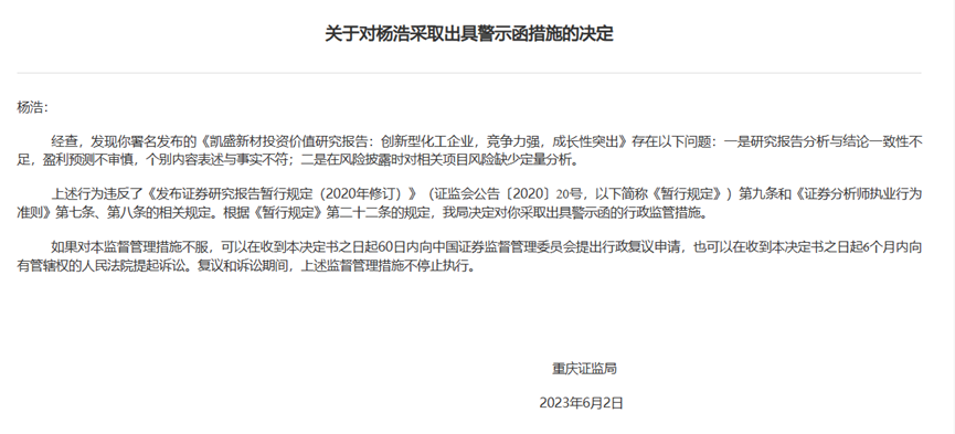 分析师杨浩署名发布的《凯盛新材投资价值研究报告:创新型化工企业,竞争力强,成长性突出》存在两大问题:一是研究报告分析与结论一致性不足,盈利预测不审慎,个别内容表述与事实不符;二是在风险披露时对相关项目风险缺少定量分析。