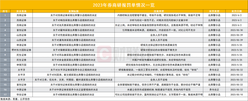 随着西南证券罚单落地,5月以来,券商研报罚单数量已增至17份,共涉及华安证券、中原证券、首创证券、太平洋、山西证券、西南证券、申港证券、野村东方国际、民生证券、申银万国等10家券商,以及18名从业人员。