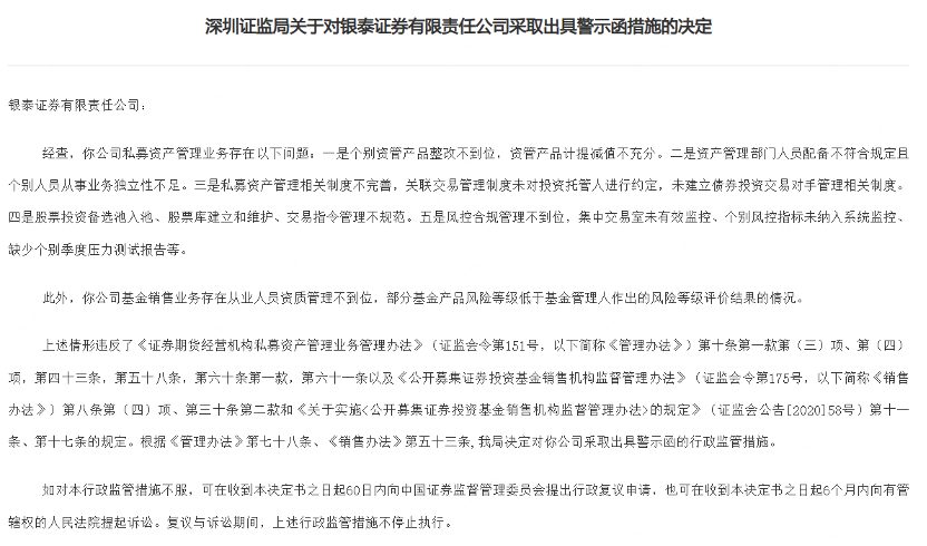 银泰证券的情况也类似,因私募资管业务存在产品整改、人员资质、管理制度、合规风控等多方面的漏洞,公司被出具警示函。