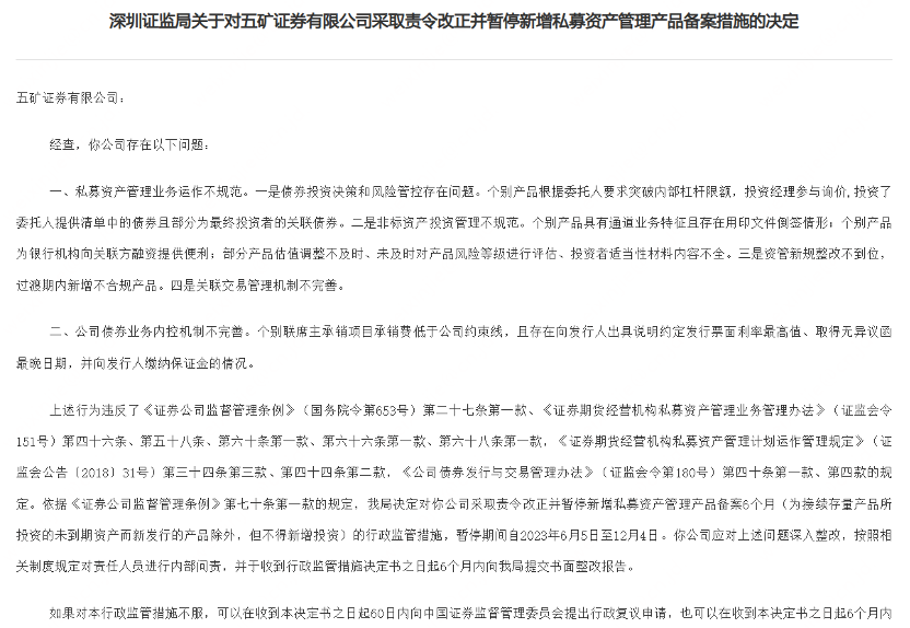 五矿证券的问题主要出在私募资产管理业务运作规范及债券业务内控不完善上。基于此,深圳局对五矿证券采取责令改正并暂停新增私募资产管理产品备案半年的措施。