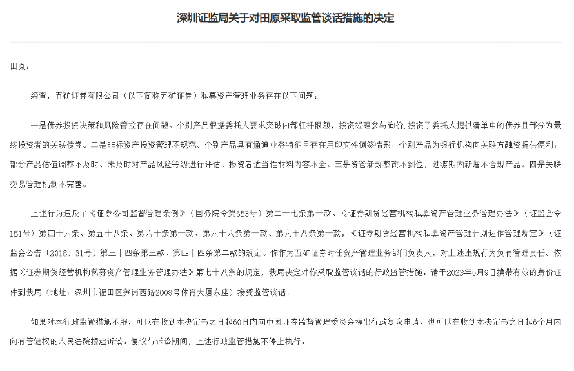 因对上述违规行为负有管理责任,五矿证券资管业务相关负责人也受到波及,时任分管资产管理业务的高管郑宇、时任资产管理业务部门负责人田原双双被采取监管谈话措施的决定。