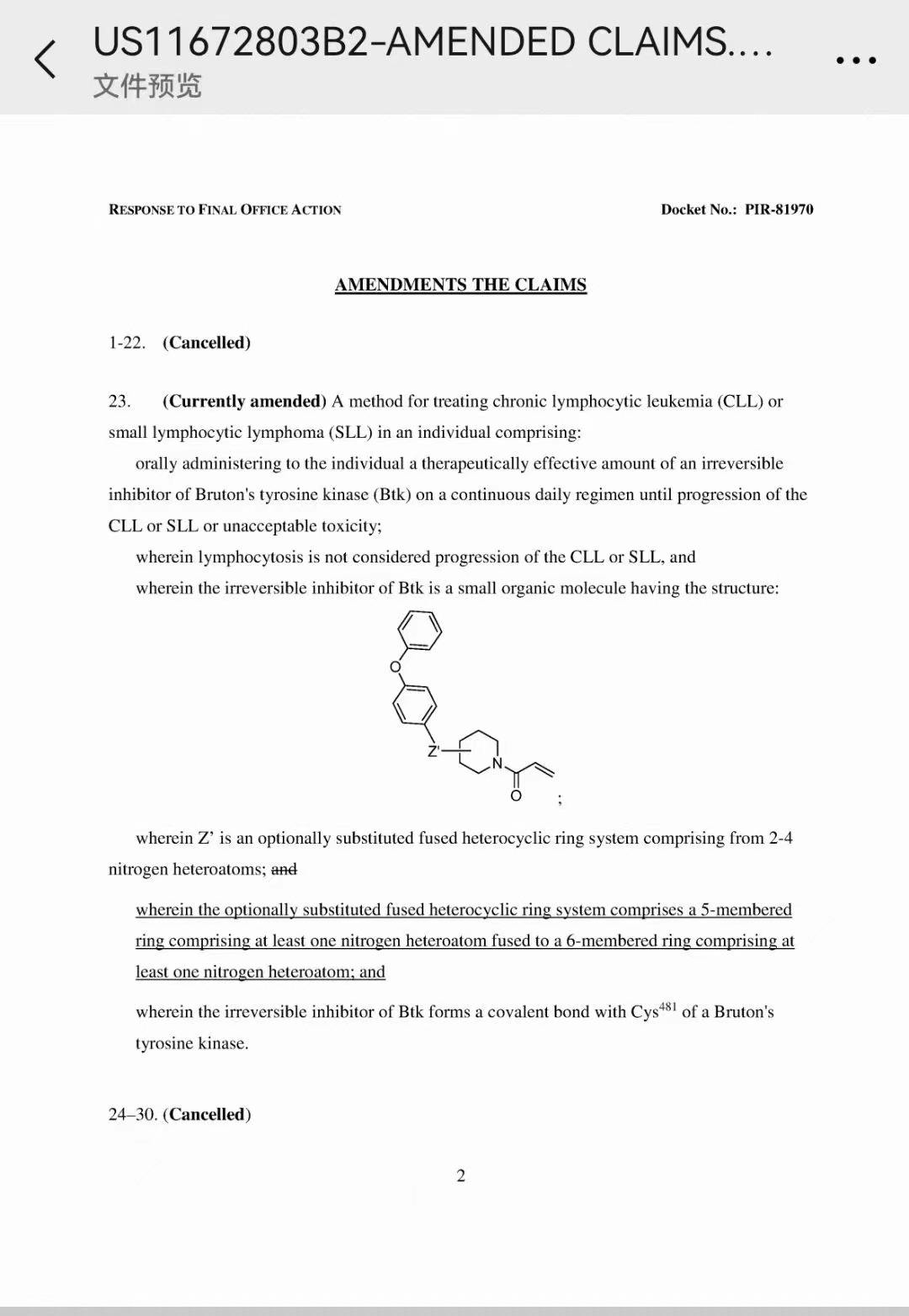 “我粗粗浏览了US11672803B2的原始说明书,其中无论描述部分、定义部分还是实施例,化合物结构式中间部分基本都是芳香性五元环和六元环稠合而成的环,而泽布替尼中间部分的双环结构中的一个环是非芳香性环,是艾伯维在授权阶段做出了修改,加入了划横线的取代基定义,才导致把泽布替尼囊括进去了。”