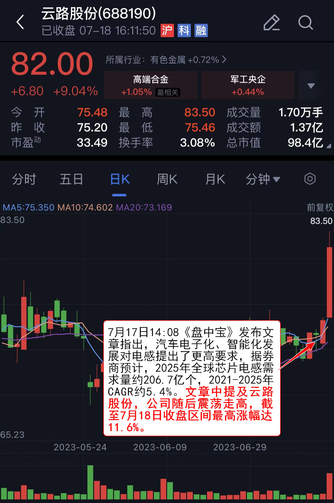 7月17日14:08 《盘中宝》发布文章指出,汽车电子化、智能化发展对电感提出了更高要求,据券商预计,2025年全球芯片电感需求量约206.7亿个,2021-2025年CAGR约5.4%。文章中提及云路股份,公司随后震荡走高,截至7月18日收盘区间最高涨幅达11.6%。