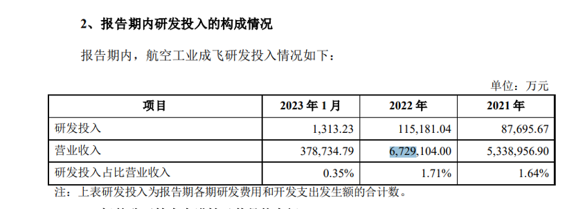 研发投入上,成飞今年1月研发投入金额为0.13亿元,营业收入达37.87亿元,研发投入占营业收入的0.35%。