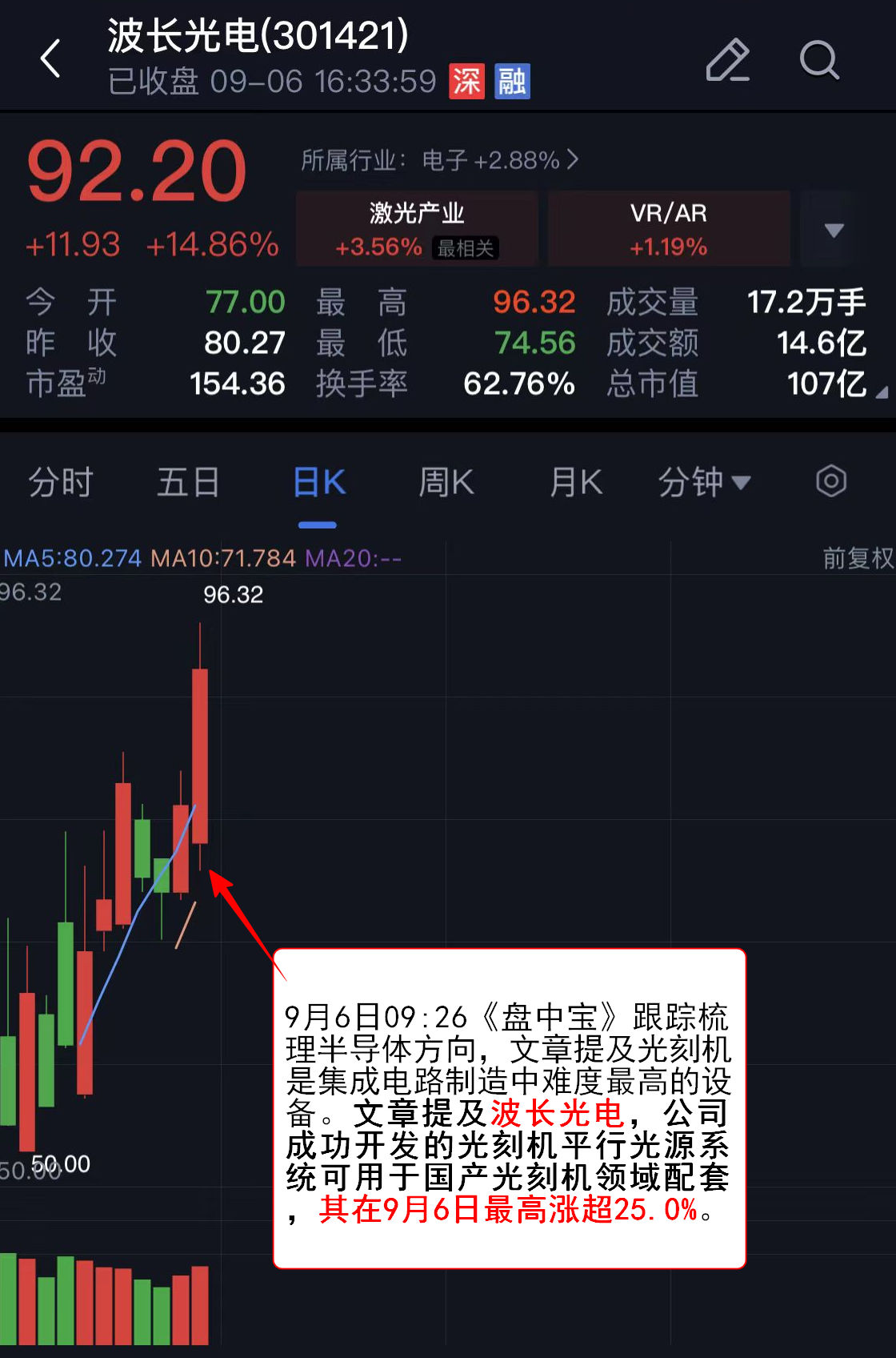 9月6日09:26《盘中宝》跟踪梳理半导体方向,据悉,光刻机是集成电路制造中难度最高的设备,生产技术极为复杂,在所有半导体制造设备中技术含量最高。主要涉及系统集成、精密光学、精密运动、精密物料传输、高精度微环境控制等多项先进技术,生产一台光刻机往往涉及到上千家供应商。文章提及波长光电,公司成功开发的光刻机平行光源系统可用于国产光刻机领域配套,其在9月6日最高涨超25.0%。