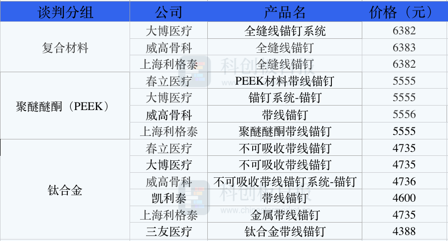 另外,在今年6月,北京市医保局还牵头对运动医学类、神经介入类、电生理类医用耗材进行了DRG联动集采。其中,带线锚钉分三组,包括钛合金、聚醚醚酮(PEEK)以及复合材料进行带量议价,基准价在6000-9000元,入门降幅30%、达标降幅40%,分别获得60%和90%的采购量。