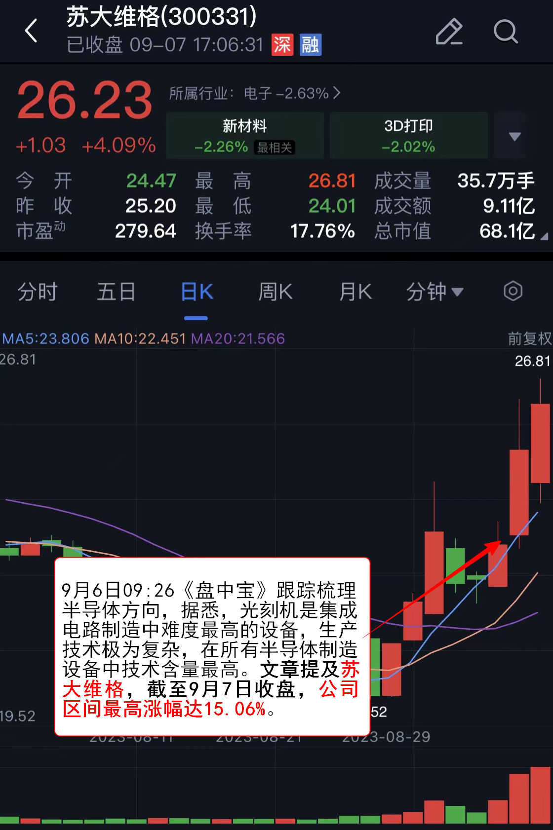 9月6日09:26《盘中宝》跟踪梳理半导体方向,据悉,光刻机是集成电路制造中难度最高的设备,生产技术极为复杂,在所有半导体制造设备中技术含量最高。文章提及苏大维格,截至9月7日收盘,公司区间最高涨幅达15.06%。