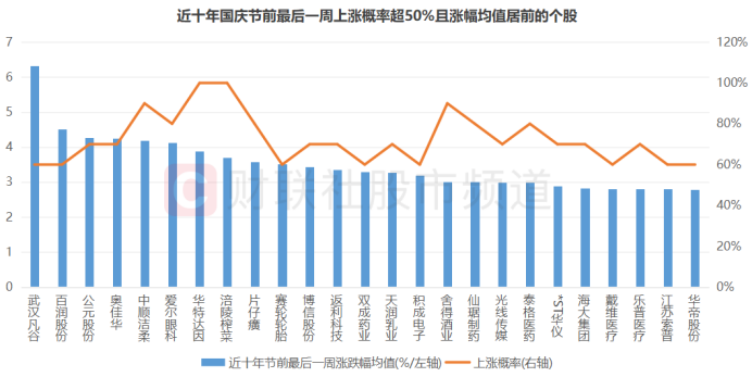 具体个股方面,仅计算历经近十年国庆节前一周行情的个股,累计共有近三成个股周度实现上涨。其中,21股周涨幅超3%,且武汉凡谷、汇通能源、海鸥住工、百润股份、公元股份、奥佳华、中顺洁柔、爱尔眼科等股涨幅均值居前。若从上涨概率上看,华特达因、涪陵榨菜近十年节前历周均实现上涨,历史战绩表现最佳,中顺洁柔、舍得酒业、淮北矿业3股的上涨概率也超9成。