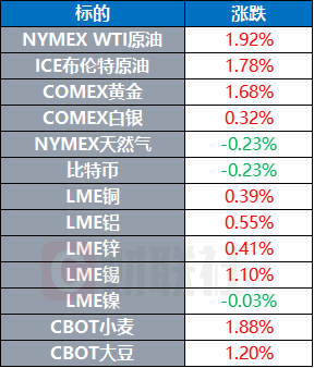 COMEX黄金期货收涨1.68%,报1968.3美元/盎司;COMEX白银期货收涨0.32%,报23.09美元/盎司。