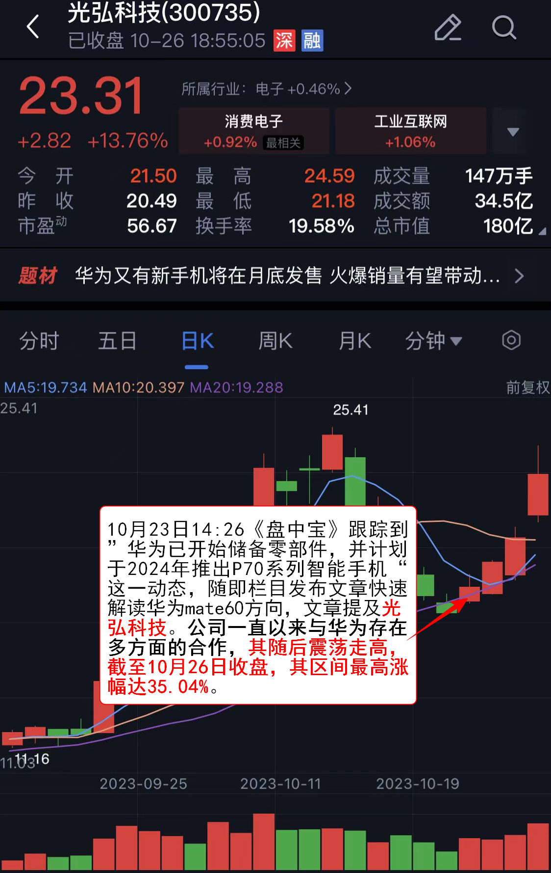 10月23日14:26《盘中宝》跟踪到”华为已开始储备零部件,并计划于2024年推出P70系列智能手机“这一动态,随即栏目发布文章快速解读华为mate60方向,文章提及光弘科技。公司一直以来与华为存在多方面的合作,其随后震荡走高,截至10月26日收盘,其区间最高涨幅达35.04%。