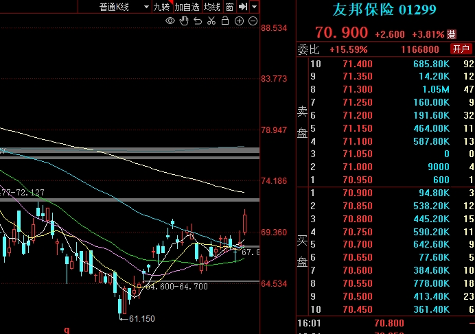 受业绩利好影响,11月3日,友邦保险(1299.HK)股价全天大涨3.81%,带动阳光保险、中国太平等港股险企全线上涨。