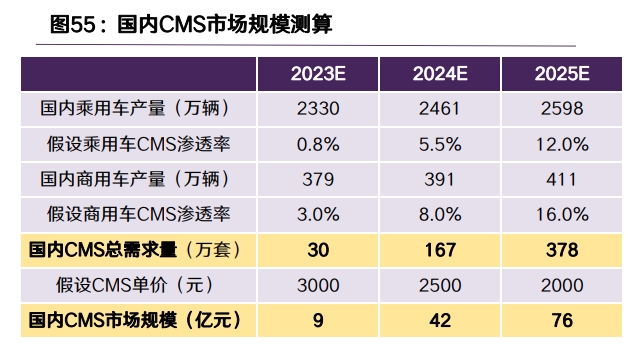 由于其具备显著的安全属性优势,预计在商用车市场将快速渗透,测算得2025年国内CMS市场规模将达到76亿元。