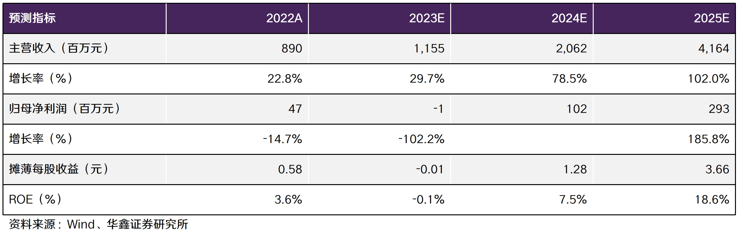 吕卓阳预计2023-2025年公司营业收入分别为11.55/20.62/41.64亿元,归母净利润分别为-0.01/1.02/2.93亿元,对应PE分别为-/52/18倍。