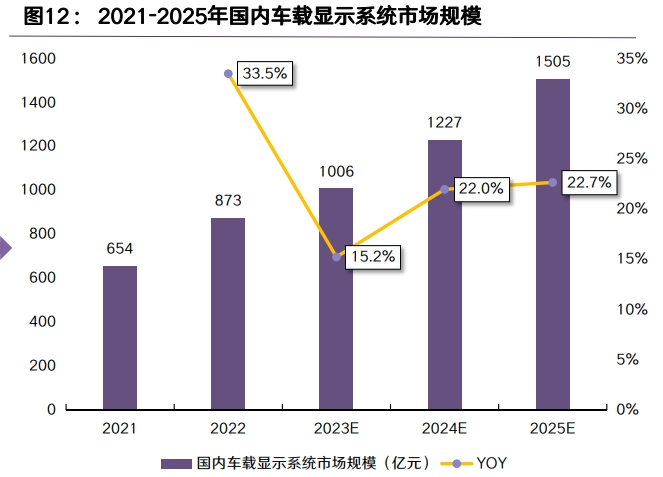 2022年国内车载显示市场规模为873亿元,预计到2025年将突破1505亿元,CAGR(2022-2025)高达20%。随着域控制器渗透,一芯多屏趋势出现,整车车厂更愿意在车型开发阶段与面板厂或模组厂合作。