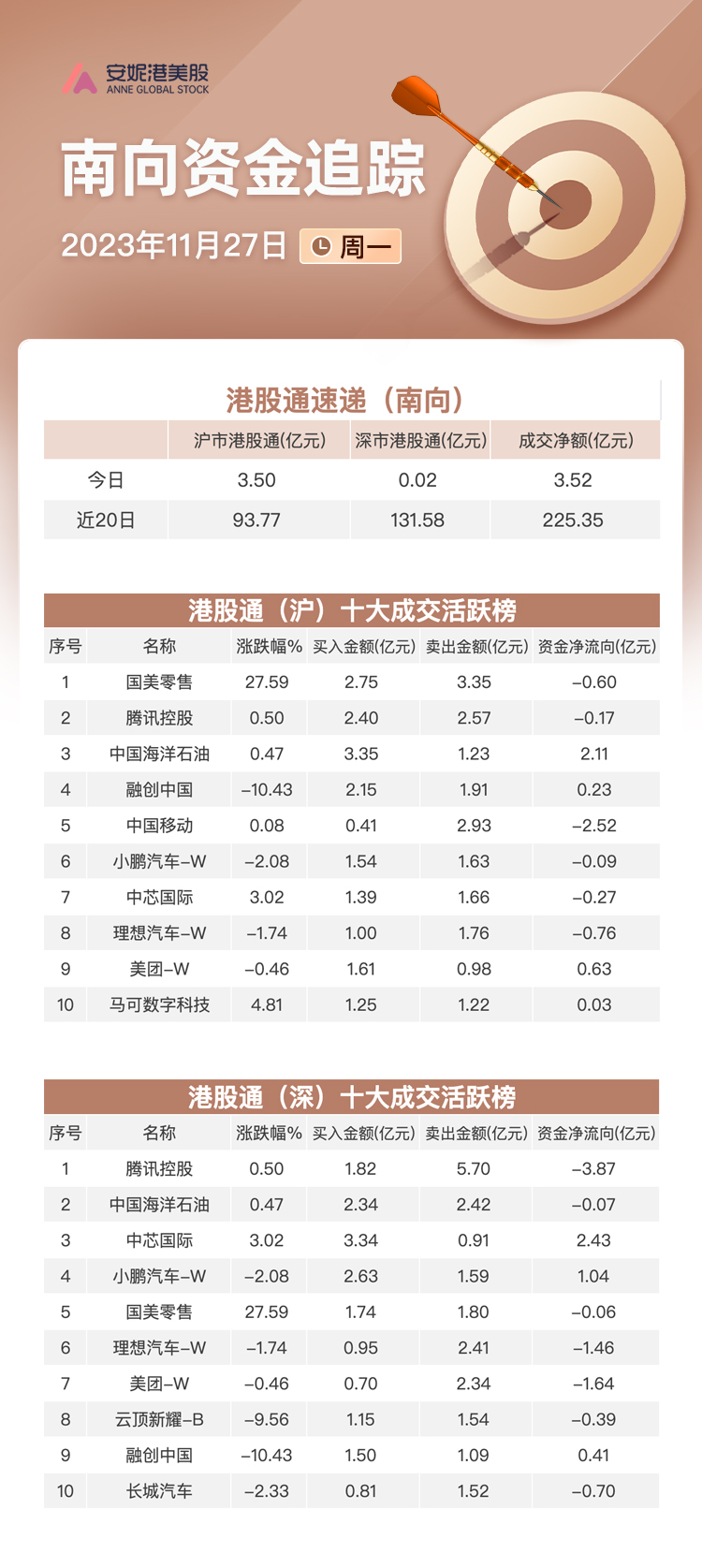 财联社11月27日讯(编辑 冯轶)据Wind数据显示,南向资金当日成交226.09亿港元,净流入3.52亿港元。其中港股通(沪)净流入3.5亿港元,港股通(深)净流出0.02亿港元。