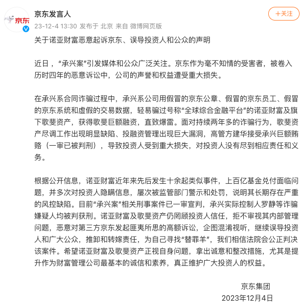 财联社12月4日电,京东集团发布关于诺亚财富恶意起诉京东、误导投资人和公众的声明称,近日 ,“承兴案”引发媒体和公众广泛关注。京东作为毫不知情的受害者,被卷入历时四年的恶意诉讼中。在承兴系合同诈骗过程中,承兴系公司用假冒的京东公章、假冒的京东员工、假冒的京东系统和虚假的交易数据,轻易骗过号称“全球综合金融平台”的诺亚财富及旗下歌斐资产,获得歌斐巨额融资,直致爆雷。面对持续两年多的诈骗行为,歌斐资产尽调工作出现明显缺陷、投融资管理出现巨大漏洞,高管方建华接受承兴巨额贿赂(一审已被判刑),导致投资人受到重大损失,对投资人没有尽到相应责任和义务。目前“承兴案”相关刑事案件已一审宣判,承兴实际控制人罗静等诈骗嫌疑人均被判获刑。诺亚财富及歌斐资产仍罔顾投资人信任,拒不审视其内部管理问题,恶意对第三方京东发起匪夷所思的高额诉讼,企图混淆视听,继续误导投资人和广大公众,推卸和转嫁责任,为自己寻找“替罪羊”,我们相信法院会公正判决该案件。希望诺亚财富及歌斐资产正视自身问题,拿出诚意和整改措施。