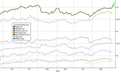 在美股的其他领域,大型科技股隔夜也普遍走强——主导年内市场上涨的科技“七巨头”中,除了Meta下跌0.5%以外,其余悉数走高。其中,芯片制造商英伟达领涨,涨幅为2.3%。苹果公司股价也上涨了2.1%,自8月初以来市值首次突破3万亿美元。