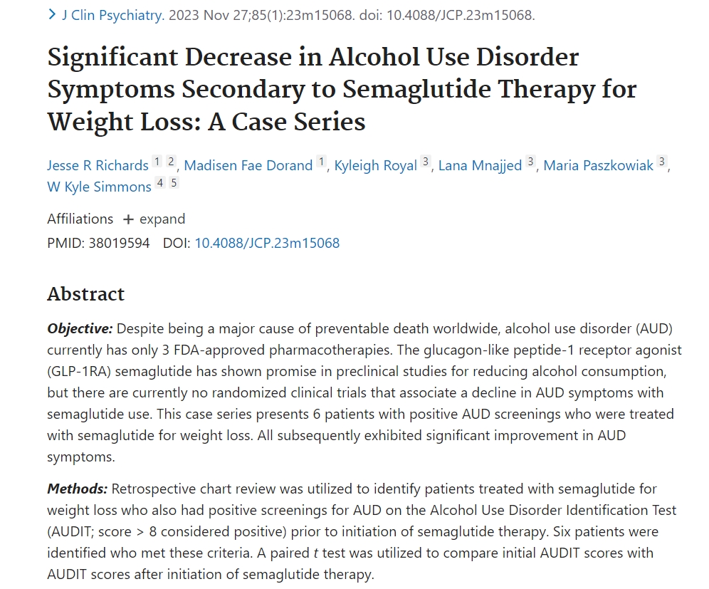 根据一项迷你研究显示,使用司美格鲁肽减肥的6名肥胖症患者,在服药的1-9个月内饮酒量均大幅减少。还有一项以白人女性为主的网络调查也显示,使用司美格鲁肽后饮酒量明显减少。