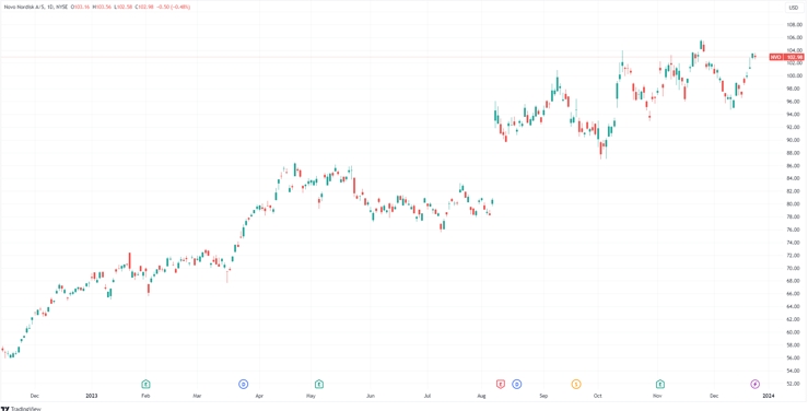 (诺和诺德股价在一年多的时间里翻了一倍,来源:TradingView)