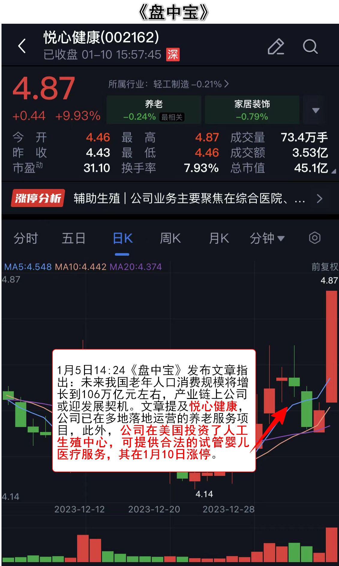 往期回顾:1月5日14:24《盘中宝》发布文章指出:未来我国老年人口消费规模将增长到106万亿元左右,产业链上公司或迎发展契机。文章提及悦心健康,公司已在多地落地运营的养老服务项目,此外,公司在美国投资了人工生殖中心,可提供合法的试管婴儿医疗服务,其在1月10日涨停。