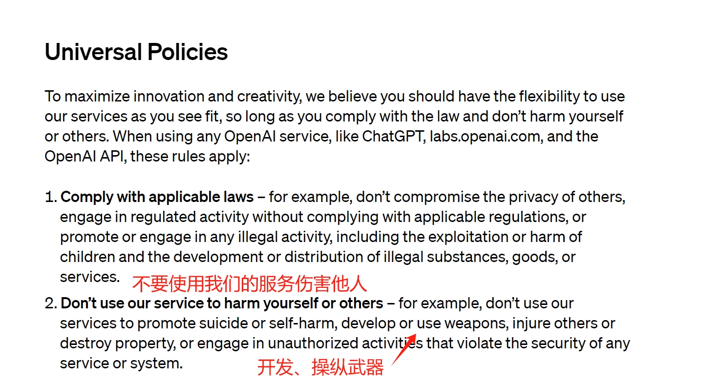 这名发言人拒绝透露,“不伤害他人”是否等同于禁止一切军事用途,仅举了一堆例子强调,OpenAI的技术不得被用于武器、(伤害或摧毁)财产,或者在未获授权的情况下侵犯任何服务或系统的安全。