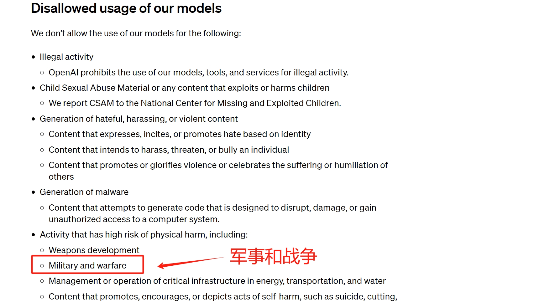 在修改前,OpenAI的条款中明确表示,禁止将公司模型用于“造成物理伤害的高风险活动”,包括武器开发、军事和战争等。“军事”一词,极为明确地将美国国防部、美军、CIA等排除出了OpenAI的用户范畴。