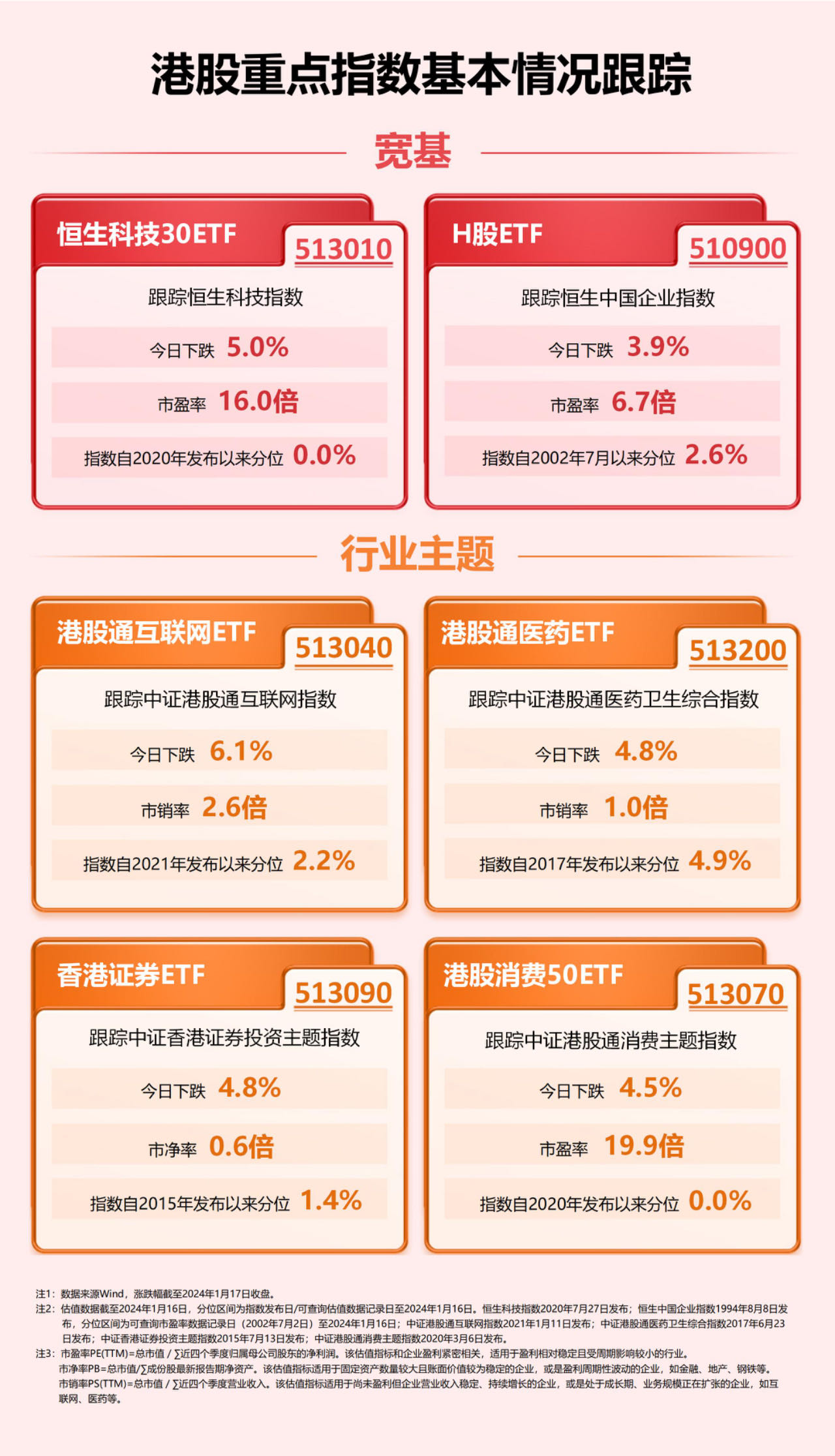 财联社1月17日电,今日港股全线收跌,港股“两宽基”恒生科技指数、恒生中国企业指数分别下跌近5%、近4%;行业主题指数中,中证港股通互联网指数、中证港股通医药卫生综合指数、中证香港证券投资主题指数、中证港股通消费主题指数跌幅均超过4%。当前港股主要指数估值均处于历史极低位置,待美联储降息预期回升,有望迎来估值修复。