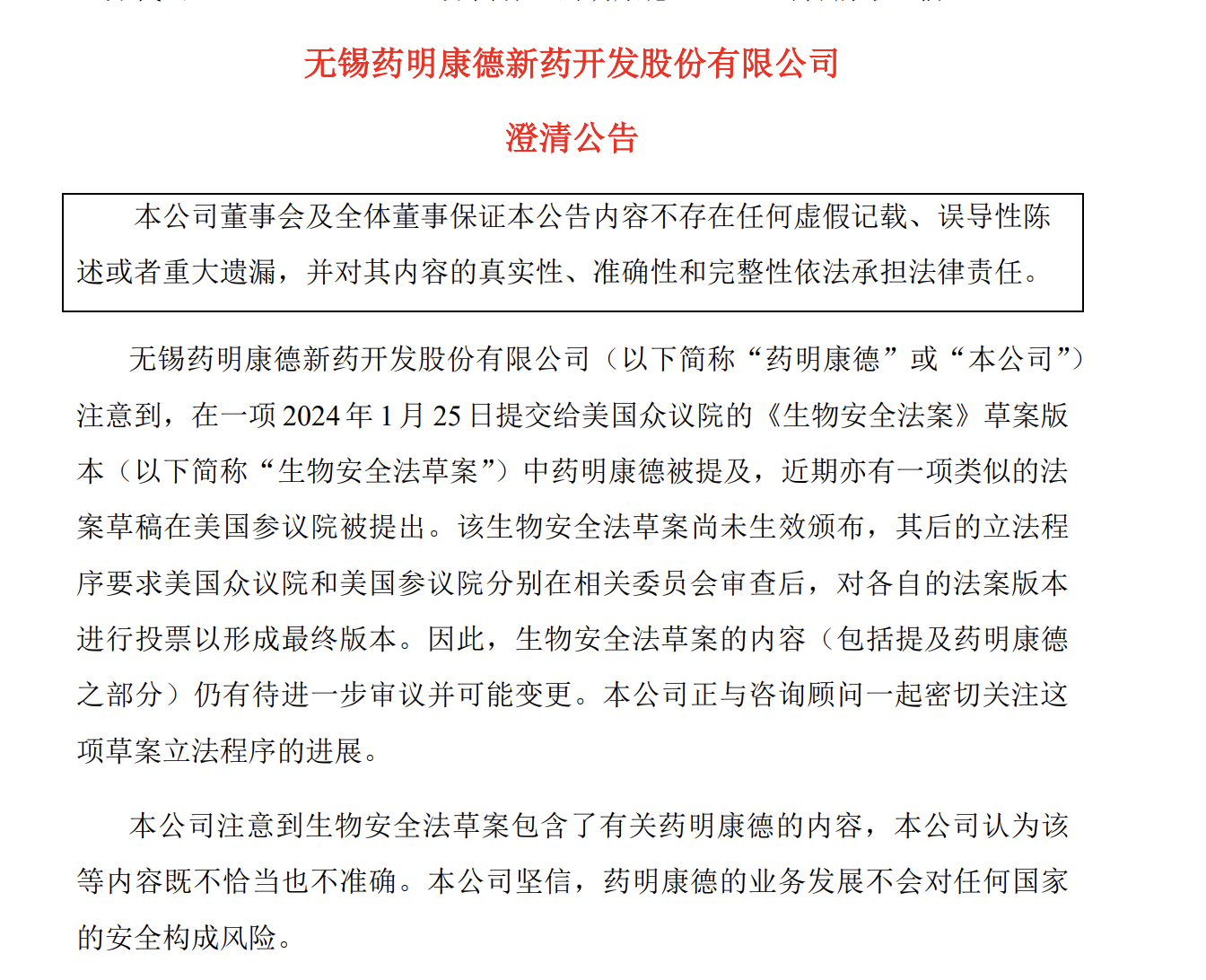 澄清公告指出,药明康德注意到,在一项1月25日提交给美国众议院的《生物安全法案》草案版本中药明康德被提及,近期亦有一项类似的法案草稿在美国参议院被提出。该草案尚未生效颁布,其后的立法程序要求美国众议院和美国参议院分别在相关委员会审查后,对各自的法案版本进行投票以形成最终版本。因此,上述草案的内容(包括提及药明康德之部分)仍有待进一步审议并可能变更。同时,药明康德正与咨询顾问一起密切关注这项草案立法程序的进展,并认为草案中涉及的有关药明康德的内容既不恰当也不准确。公司的业务发展不会对任何国家的安全构成风险。