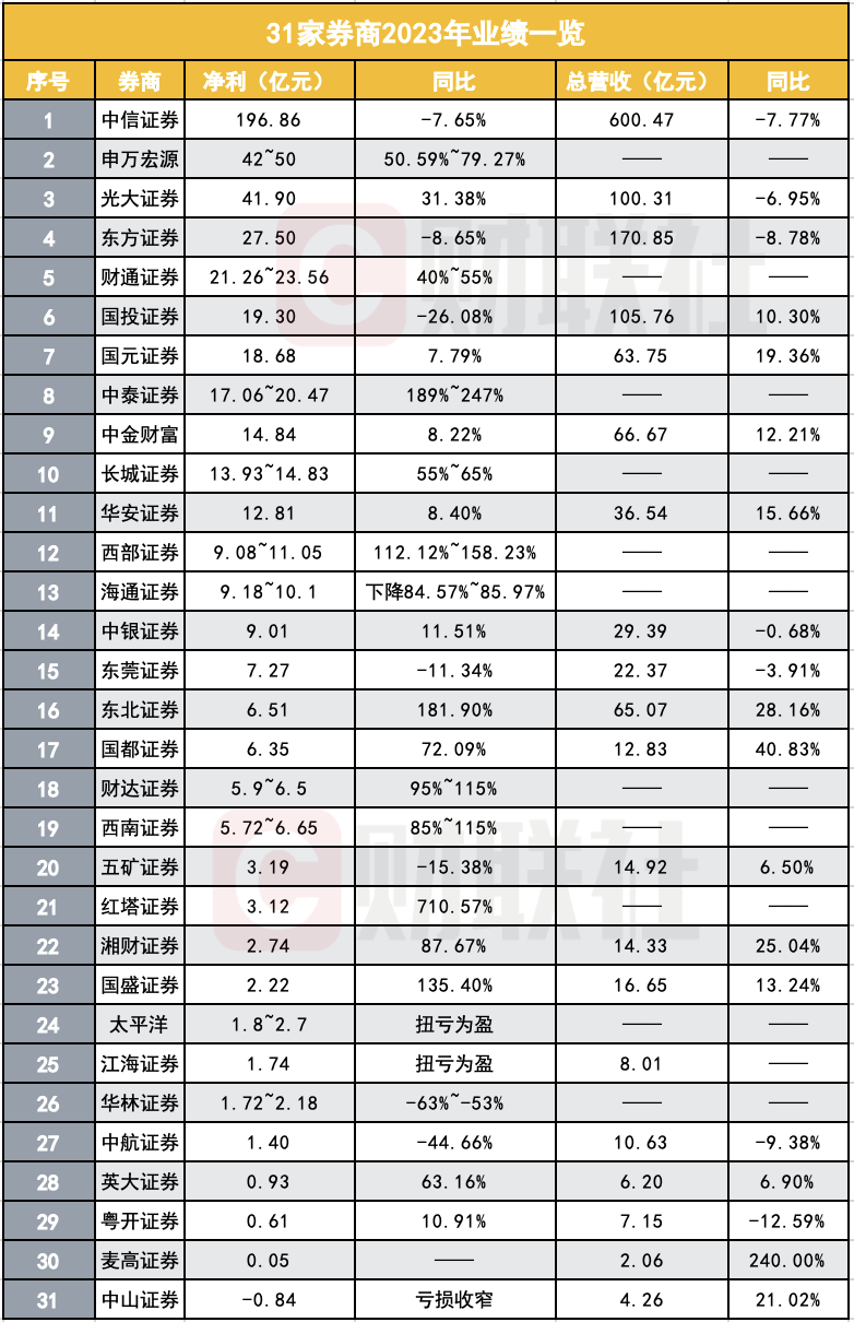 据记者不完全统计,目前已有至少31家券商发布业绩预告,其中大多数预增,除个别公司以外,行业整体业绩向好。中信证券以归母净利196.86亿元高居行业榜首,其他净利润规模较大的券商还包括申万宏源(42亿元至50亿元)、光大证券(41.9亿元)、东方证券(27.5亿元)、财通证券(21.26亿元至23.56亿元)。