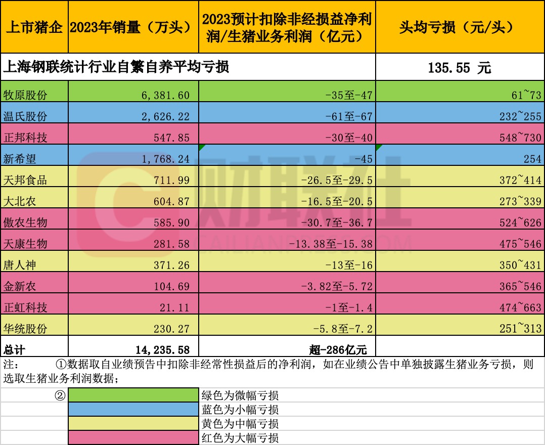 财联社1月31日讯(记者 张晨静 王平安)2023年猪价持续低迷,上市猪企集体陷入亏损“泥潭”。近日已有超过15家上市猪企公布2023年业绩预告,据统计累计出栏量达到1.4亿头,但整体亏损已超286亿元,同时多数上市猪企头均亏损额高于市场平均水平,财联社记者从业内获悉,2023年产能去化持续进行,预计2024年整体猪价或将好于去年。