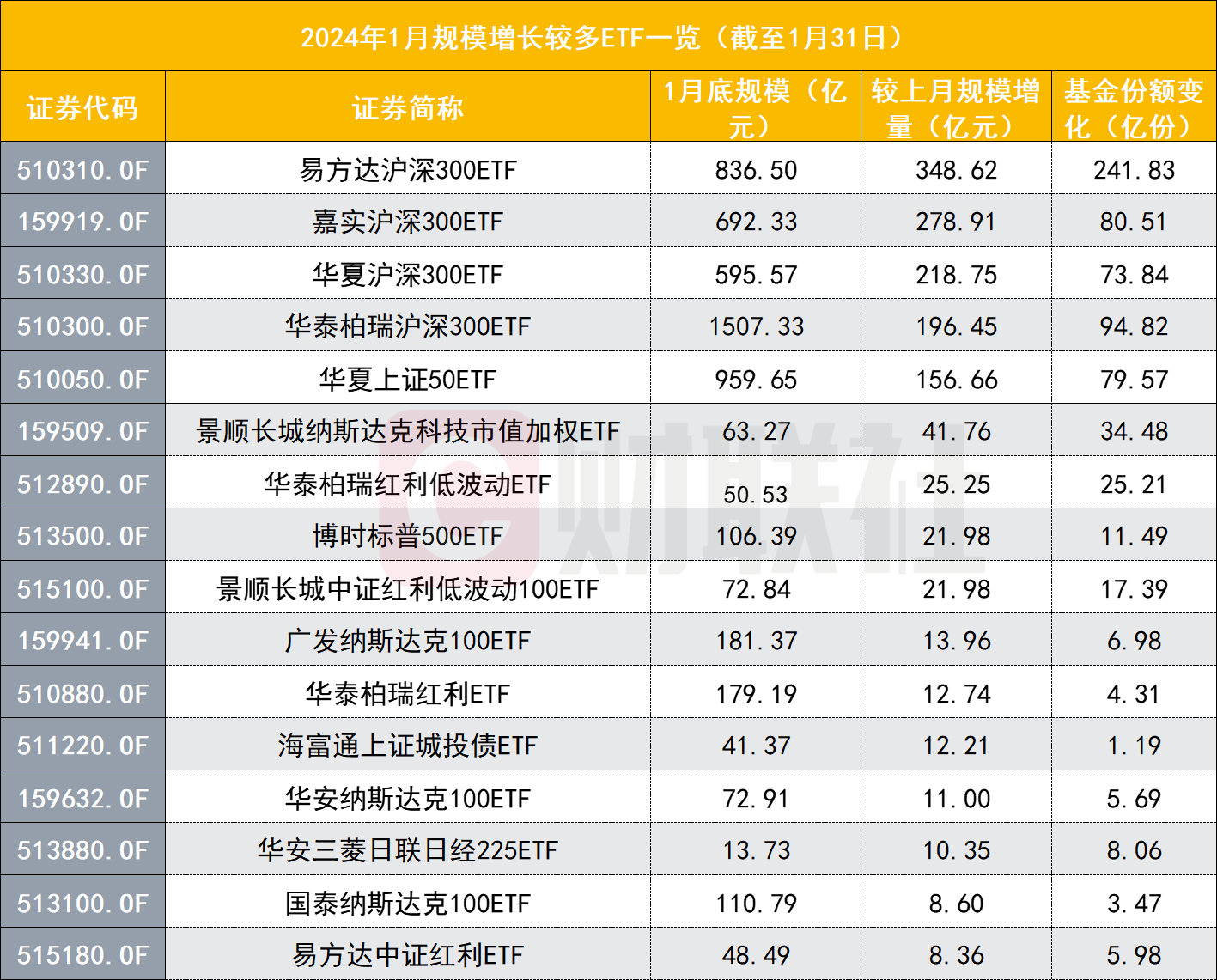 而有3只沪深300ETF则因资金大力度抄底,规模跻身500亿级行列。作为1月规模增量最大的股票ETF,易方达沪深300ETF规模从去年底的487.88亿元,迅速增至836.5亿元,增加了348.62亿元,增幅超七成。