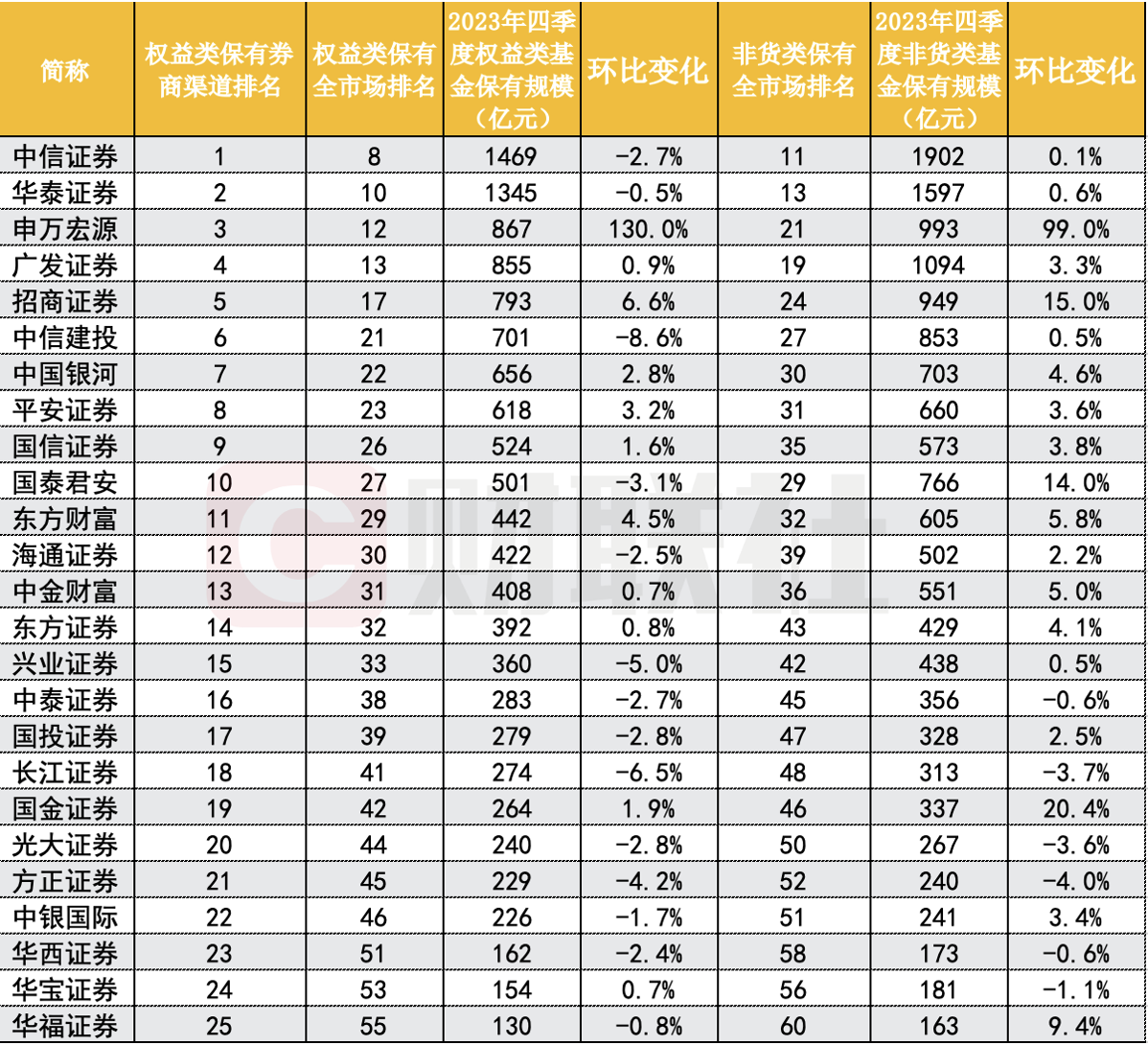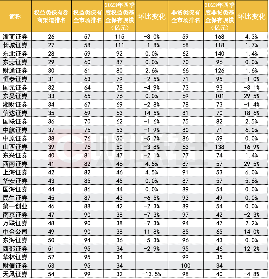 第三,四季度券商渠道的一大特征就是环比增速放缓。2023年四季度,在52家有可比数据的券商(除去新入榜的华林证券和财信证券)中,21家券商的权益保有规模实现增长,占比仅有四成。而在上个季度,券商渠道超过八成都实现了正增长。