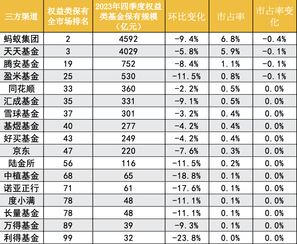 第三方代销机构的基金保有规模仍持续下滑。截至2023年四季度末,三方渠道的权益保有总规模为1.30万亿元,环比下滑7.2%;市占率为19.1%,环比下滑0.68%。对于三方渠道的规模下滑,业内人士称主要是受零售端赎回压力的影响。蚂蚁财富、天天基金四季度的权益类保有规模分别为4592亿元、4029亿元,分别环比下滑9.4%、5.8%。