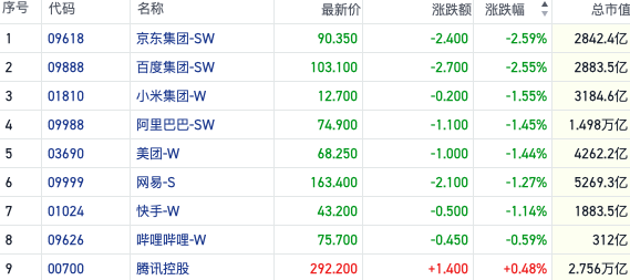 盘面上,今日权重科技股集体低迷,京东、百度跌2.5%,美团、阿里巴巴、网易、快手皆跌超1%。