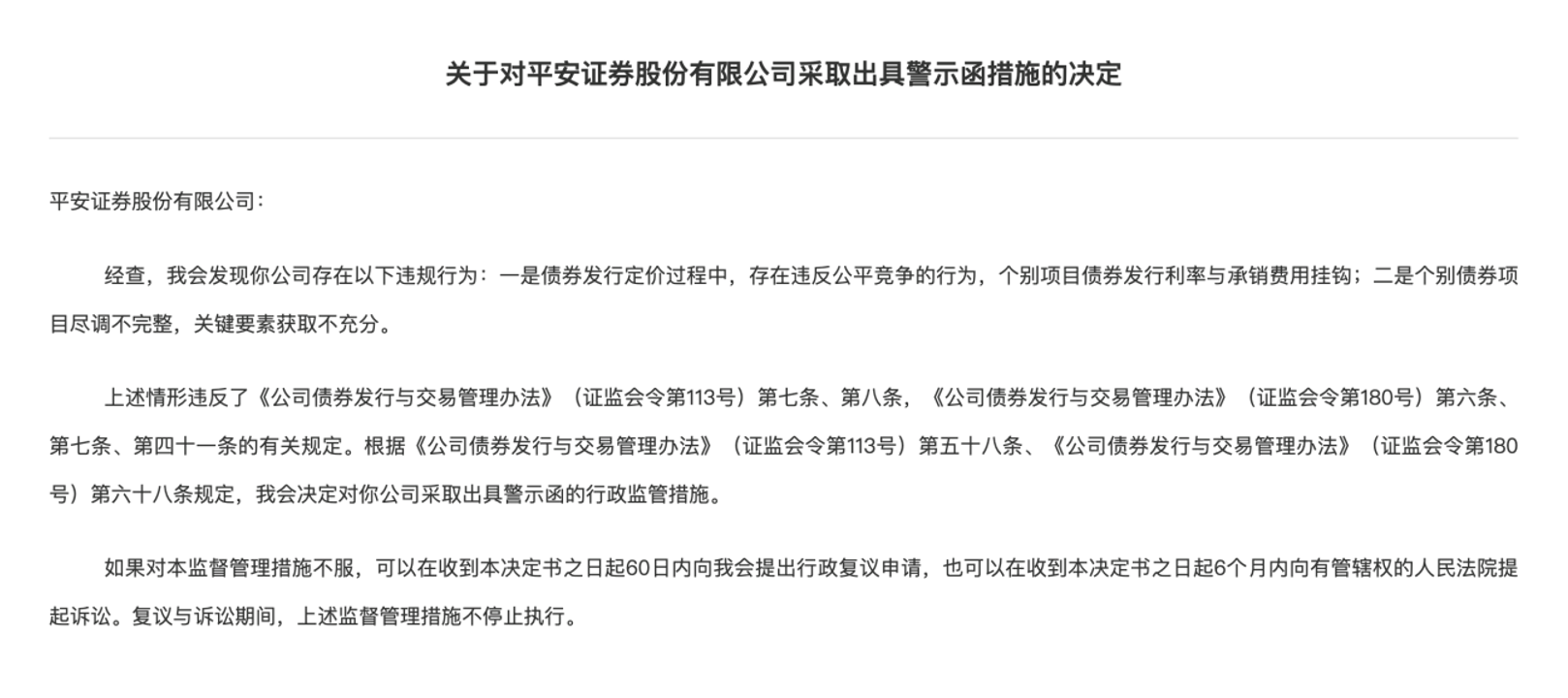 由于平安证券上述情形违反了以上规定,因此证监会决定对其采取出具警示函的行政监管措施。