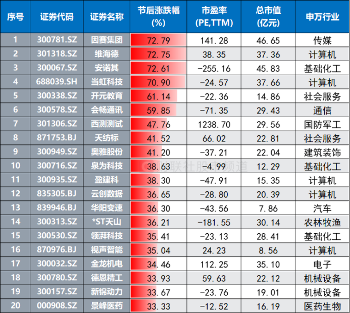 注:节后涨幅居前且总市值不足50亿元的个股(截至2月21日收盘)