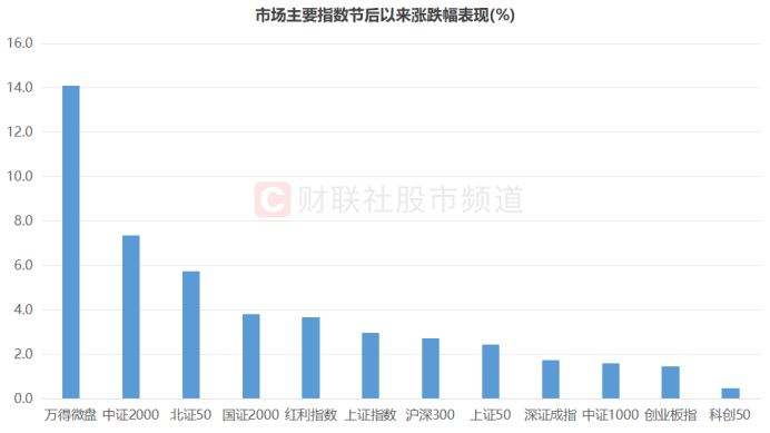 财联社2月21日讯(编辑 梓隆),自节后以来,A股整体延续反弹,其中,小微风格相对占优。具体数据上看,截至今日(2月21日)收盘,万得微盘股指数大涨超14%,中证2000、国证2000指数也分别上涨近7.38%、3.81%,代表权重股的沪深300、上证50指数也表现活跃,其节后涨幅均超2%,而科创50指数的修复程度则相对靠后。