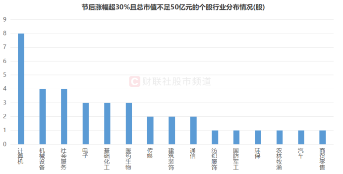 注:节后涨幅超30%且总市值不足50亿元的个股行业分布情况(截至2月21日收盘)