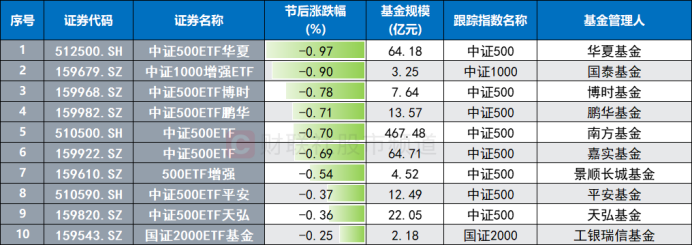 注:节后涨幅/跌幅居前的主要规模指数ETF