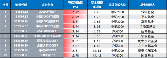 受小微盘股近日反弹迅猛提振,与之相关ETF节后也表现亮眼。截至今日收盘,仅统计基金规模超1亿元的主要规模指数ETF(上证50、沪深300、中证500、中证1000、国证2000、中证2000),其中,跟踪中证2000指数的多只ETF涨幅明显居前,沪深300相关的ETF也表现出色,而跟踪中证500指数的不少ETF则在节后明显回落,但其跌幅均未超1%。