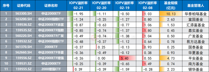 注:中证2000相关ETF今日溢折率数据(溢折率数据截至2月21日收盘,基金规模截至2月20日数据)