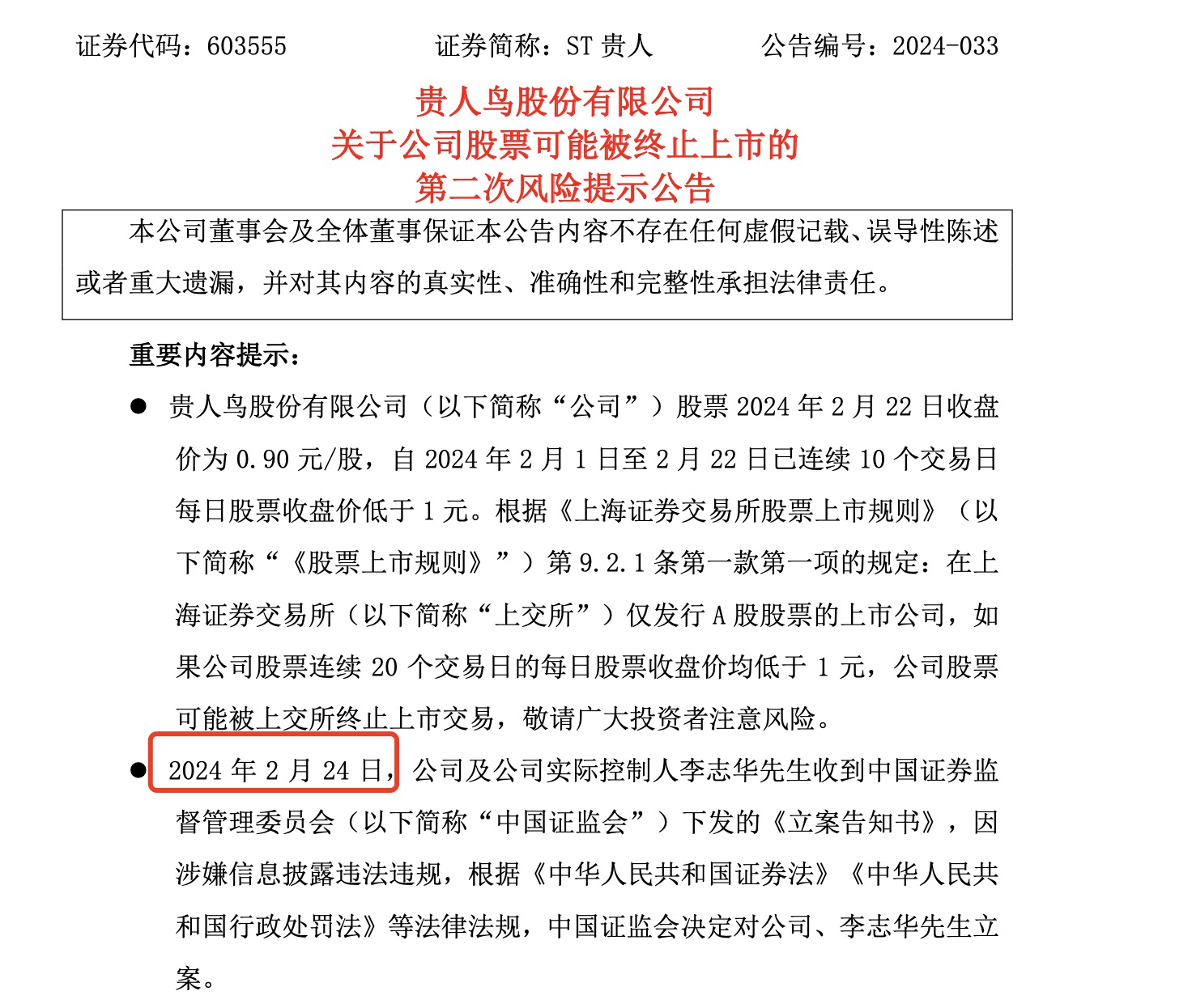 财联社2月22日讯(记者 陈抗)滑落退市边缘的ST贵人(603555.SH)及实控人李志华因涉嫌信息披露违法违规,今日正式收到证监会下发的《立案告知书》。然而,在公司今晚的公告中,收到告知书的时间竟写作“2月24日”,也就是两天后。对此,有股民调侃“迫不及待”。