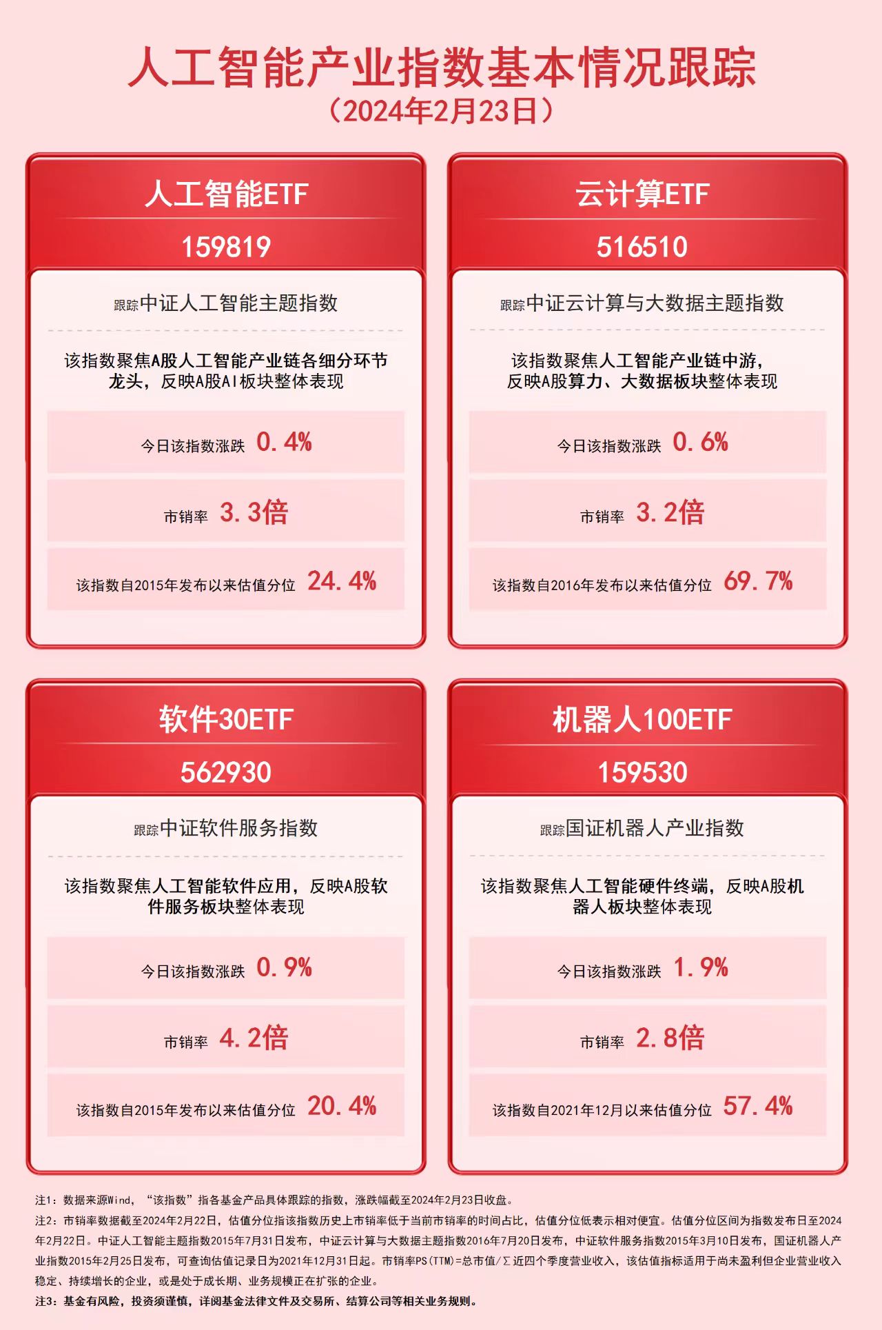 财联社2月23日电,截至今日收盘,中证人工智能主题指数上涨0.4%,中证云计算与大数据主题指数上涨0.6%,中证软件服务指数上涨0.9%,国证机器人产业指数上涨1.9%。