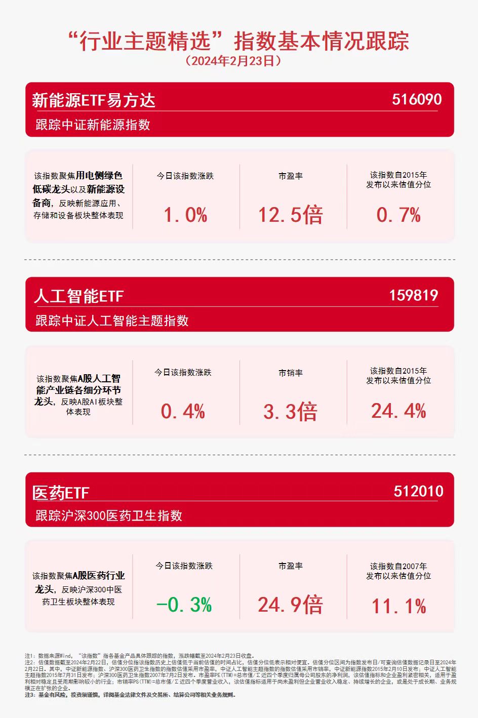 财联社2月23日电,截至今日收盘,中证新能源指数上涨1%,中证人工智能主题指数上涨0.4%,沪深300医药卫生指数下跌0.3%。