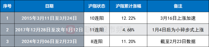 注:上证指数近10年期间8连阳及以上行情(不计算假阳线和假阴线、截至2024年2月23日数据)