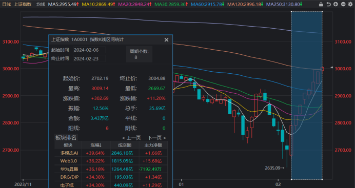 财联社2月23日讯(编辑 梓隆),今日(2月23日),市场整体继续“高歌”前进,不仅再度掀起“百股涨停”,沪指也成功收涨,并实现罕见的8日连阳,期间累计上涨近11.2%。目前,沪指已重返3000点关口,同时也尽数收复今年以来全部跌幅。