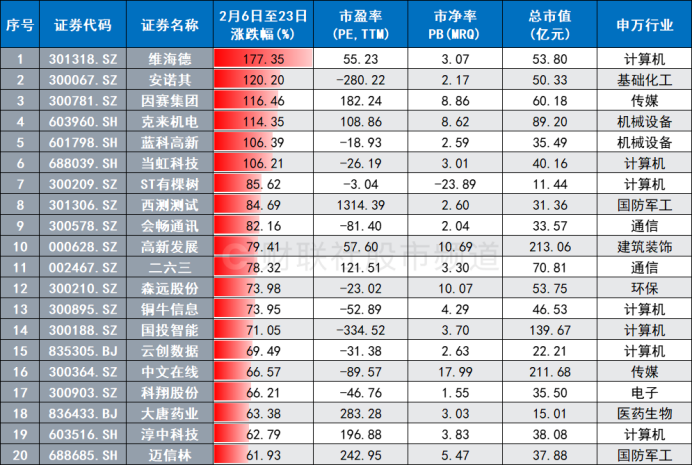 具体个股方面,在沪指8连阳的期间,不少牛股成功“崭露头角”。从数据上看,不计算上市新股,A股在2月6日至23日期间平均上涨近20.3%,且有63股涨幅超50%。其中,维海德、安诺其、因赛集团、克来机电、蓝科高新、当虹科技6只个股的股价实现翻倍增长,此外,ST有棵树、西测测试、会畅通讯、高新发展、二六三、森远股份、铜牛信息等股也涨幅居前。