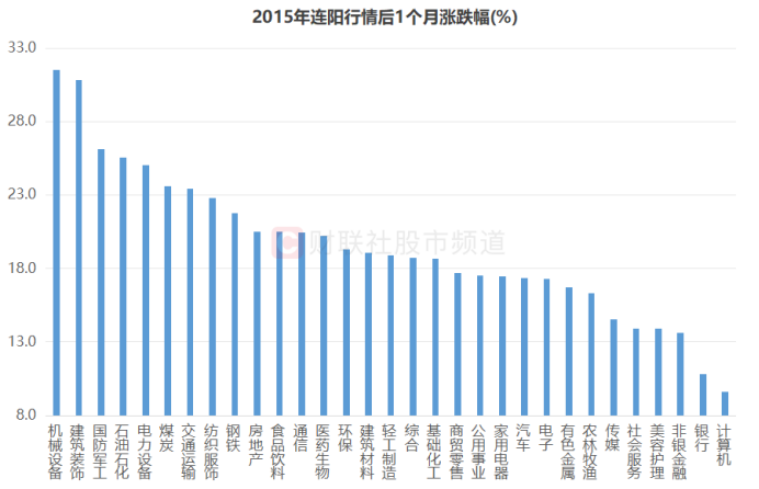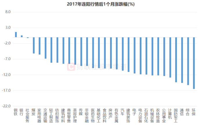 若是统计两次连阳行情后续市场表现,在2015年连阳行情后1个月,沪指继续走高并录得近19%的区间涨幅,同时,大小盘指数同期涨幅接近,机械设备、建筑装饰、国防军工、石油石化、电力设备板块占优。在2017年连阳行情后1个月行情中,沪指有所调整,累计回撤超6%,同时,红利指数和大盘股指数表现相对抗压,钢铁、银行、社会服务表现相对较好。