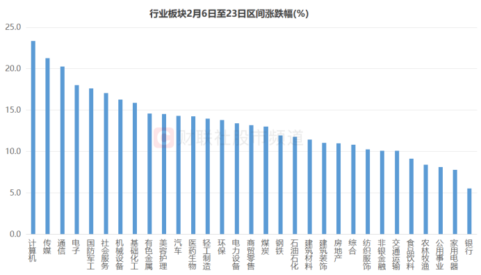 注:行业板块2月6日至23日区间涨跌幅(截至2月23日收盘)