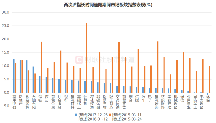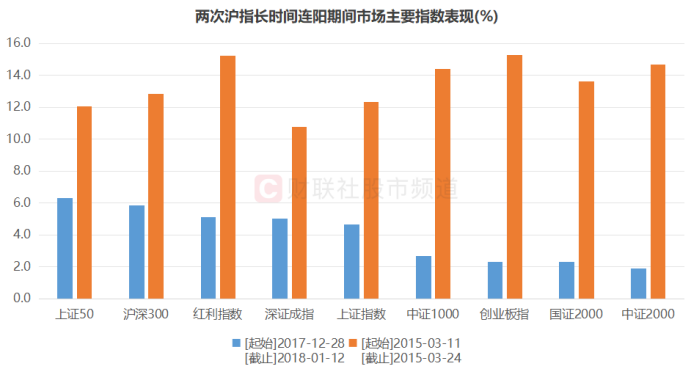 从上述两段行情统计,在2015年3月沪指10连阳期间,市场主要指数均有超10%的上涨,其中,创业板指、红利指数以及中小盘指数相对更占优。而在2017年12月至次年1月沪指11连阳期间,权重股指数及红利指数涨幅居前。分行业来看,2015年连阳行情中,计算机、建筑装饰、钢铁板块占优,而在2017年连阳行情中,家用电器、房地产、食品饮料板块涨幅居前。